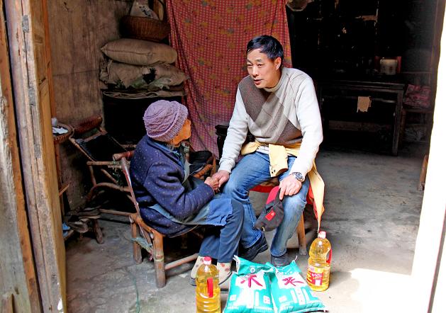 事情是这样的:富阳某地有一位年逾九旬的孤寡老人,身有残疾,孤苦伶仃,家徒四壁,生活很是穷苦,紧靠一个亲戚接济,定期送些大米蔬菜藉以度日。三年前丁关根因公出差路过此地,发现了这位老人,攀谈之余同情、怜悯之心油然而生,于是抽空前往探视慰问,送去现金,还多次为老人购买大米、食用油等生活用品,关心照顾老人的生活。阿婆对这位从不留下姓名的无名英雄感激涕零,称赞不已。