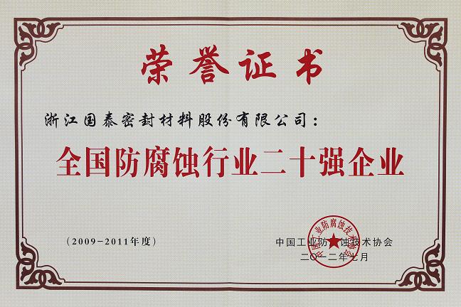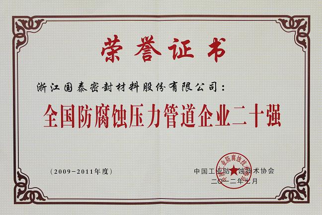 bw必威西汉姆联官网密封荣获“2009-2011年度全国防腐蚀行业20强企业”(综合排名第七)和“2009-2011年度全国防腐蚀压力管道企业20强”(综合排名第二)两项荣誉。