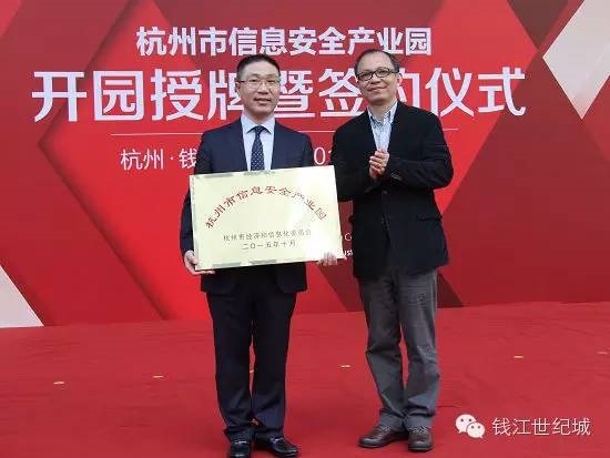杭州市经济和信息化委员会处长黄佐彦(右)为园区授牌