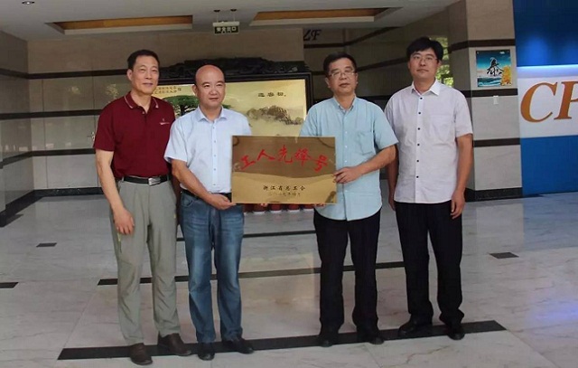 6月30日,受省总工会委托,萧山区总工会党组副书记、副主席胡国荣、生产生活部长顾周兴、原生产生活部长高宜贤、宣传部长瞿波一行莅临我司慰问,向我司石墨板材车间授牌“浙江省工人先锋号”荣誉称号。我司工会主席郭华忠、总经理助理丁关根热情接待,并接受了授牌。
